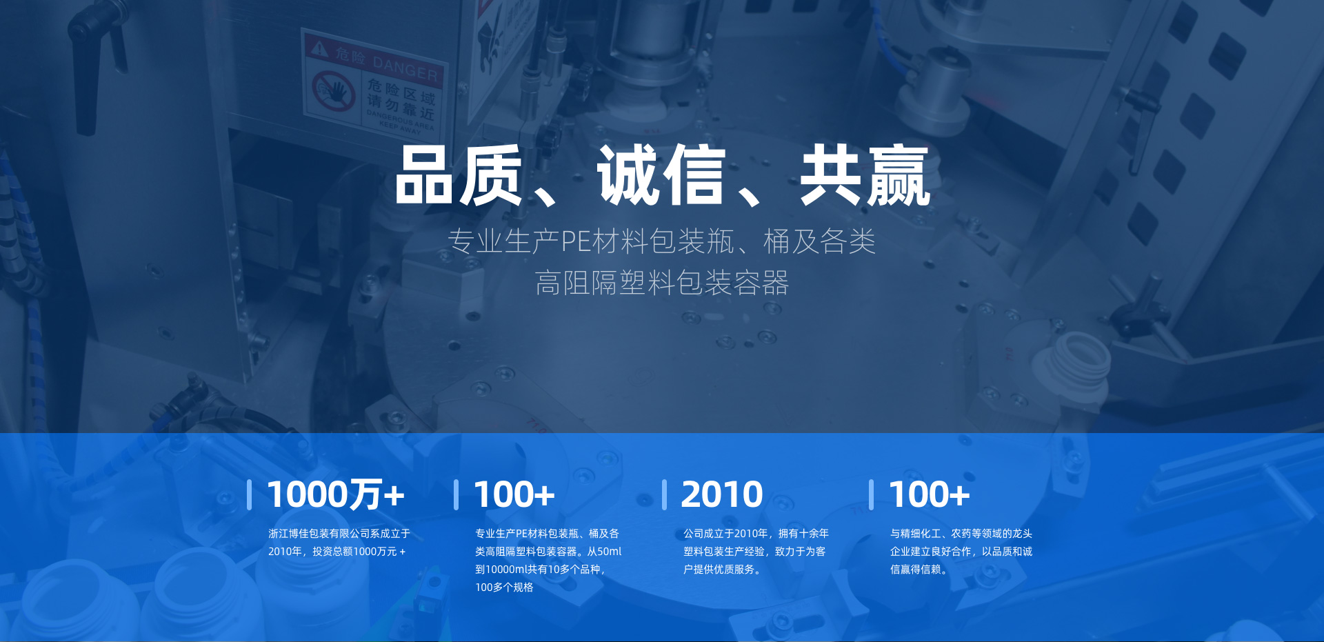 公司簡介浙江博佳包裝有限公司成立于2010年,總投資1000萬元。公司坐落于風(fēng)景秀麗的杭州,是國內(nèi)領(lǐng)先的塑料包裝瓶生產(chǎn)基地和原材料供應(yīng)商。自成立以來,博佳包裝與精細(xì)化工、農(nóng)藥等行業(yè)的龍頭企業(yè)建立了長期穩(wěn)定的合作關(guān)系,以卓越品質(zhì)和誠信服務(wù)贏得了廣泛信賴。博佳專注于PE材料包裝瓶、桶及各類高阻隔塑料包裝容器的研發(fā)與生產(chǎn)。產(chǎn)品涵蓋50ml至10000ml的多種規(guī)格,擁有10余個(gè)品種系列,100多種不同規(guī)...